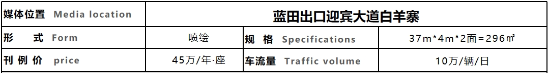 廣告牌位于101國道與藍田高速出口交匯,迎賓大道白羊寨處,同時也是進出藍田的西大門,地處藍田工業(yè)園區(qū),毗鄰藍田經開智造園,交通四通八達,車流量巨大,視覺效果極佳,是企業(yè)提升品牌知名度、促進銷售的絕佳位置。