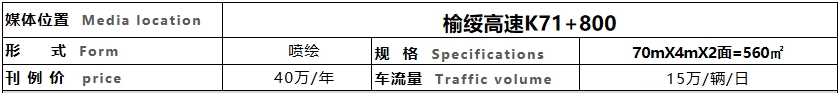 該廣告位于榆綏高速K71+800處,附近視野開(kāi)闊,此媒體形象氣派,車(chē)流量巨大,是建立良好品牌知名度、美譽(yù)度的最佳方式。
